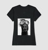 Estampa central e em preto e branco, apresentando um cavalo em close-up, com orelhas voltadas para trás e vento batendo no rosto e na crina, usando óculos de aviador grandes e reflexivos. A imagem é cômica e dinâmica, capturando um momento de liberdade e velocidade, criando um ponto focal visualmente impactante.