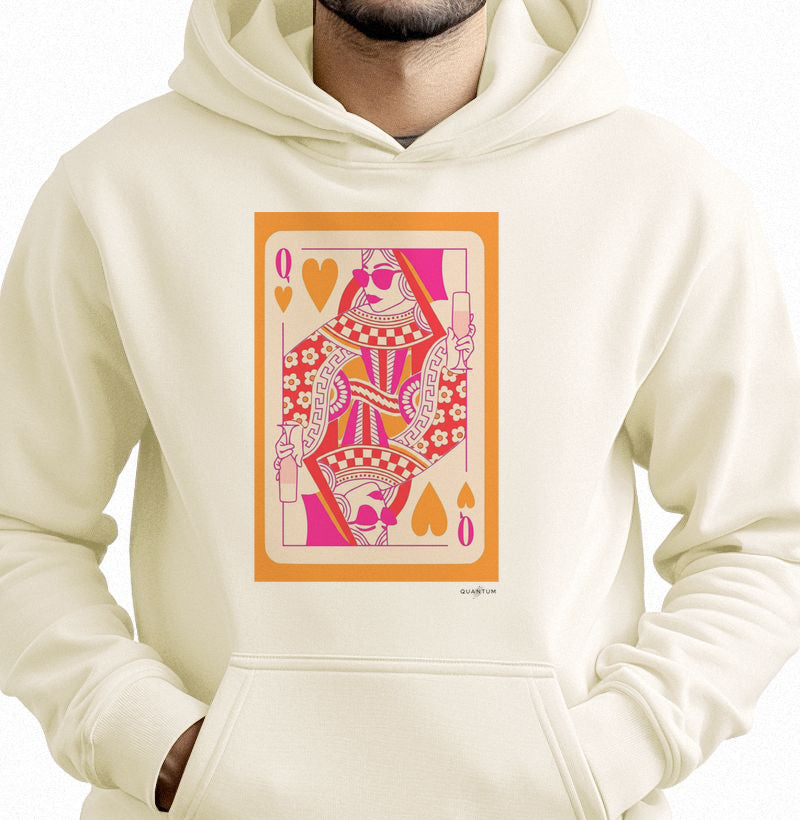 O Moletom com Capuz "Dama" é a escolha ideal para quem busca o máximo de conforto e funcionalidade, com um visual ousado e vibrante inspirado nas cartas de baralho. Ele une o aconchego do moletom com capuz e bolso canguru a um design fun e cheio de atitude.