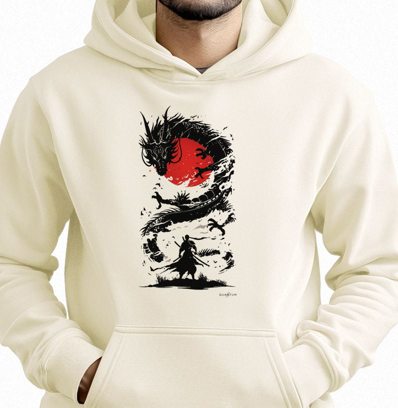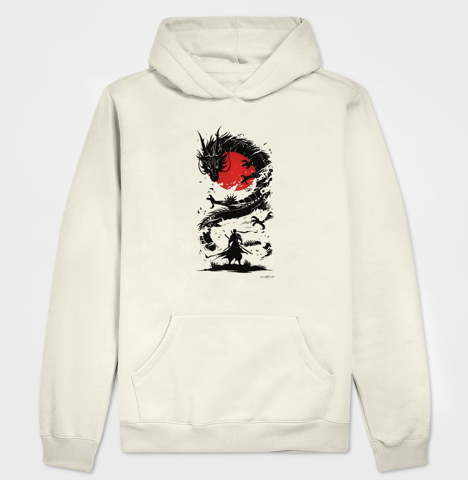 Estampa central e imponente, apresentando a silhueta de um dragão oriental em tons de preto e cinza, emoldurado por um sol vermelho intenso (alusão à bandeira japonesa). Abaixo do dragão, a figura de um guerreiro (samurai ou espadachim) em pose de combate adiciona um toque épico e de desafio.