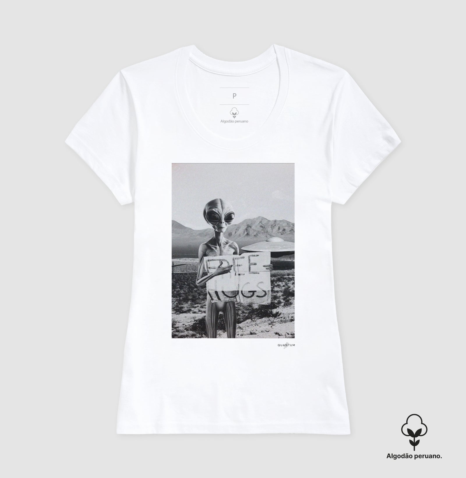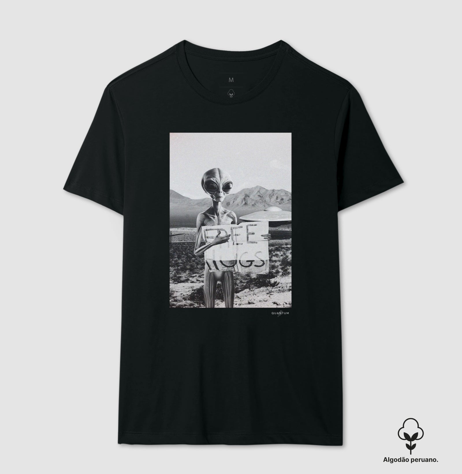 A estampa em preto e branco apresenta o alienígena cinzento em um cenário desértico, segurando a placa "FREE HUGS". O alto contraste da foto confere uma profundidade artística e um toque vintage, unindo o tema sci-fi com um gesto acolhedor e inesperado.