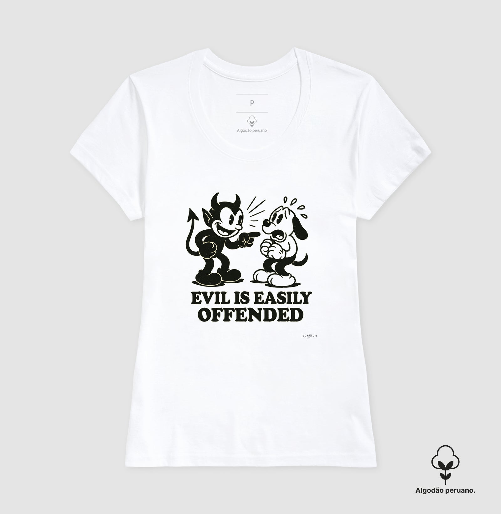 Estampa central e cômica, em estilo de desenho animado clássico. Apresenta um pequeno demônio em pose acusatória e um cachorro assustado e chorando, subvertendo os papéis. Abaixo, a frase "EVIL IS EASILY OFFENDED" satiriza a hipersensibilidade.