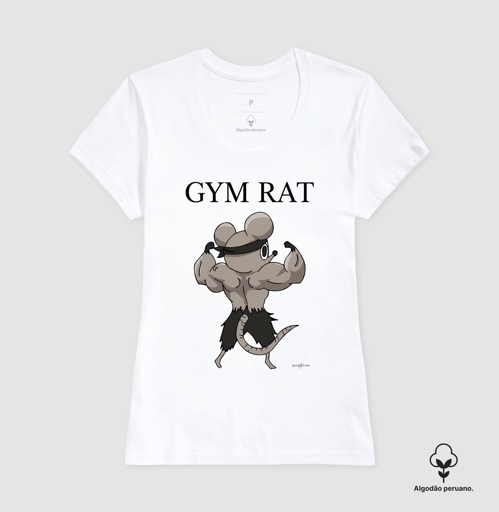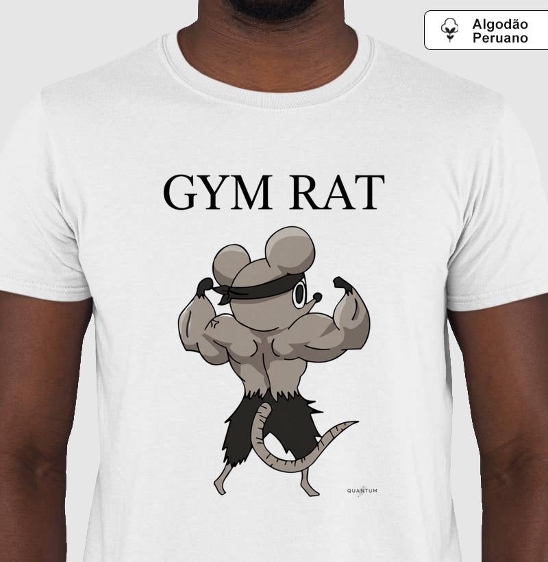 Estampa central e bem-humorada, apresentando a frase "GYM RAT" acima de um rato em estilo cartoon, extremamente musculoso e bombado, fazendo uma pose de flexão de bíceps. O design é divertido e celebra de forma irreverente o foco e a rotina de treino.