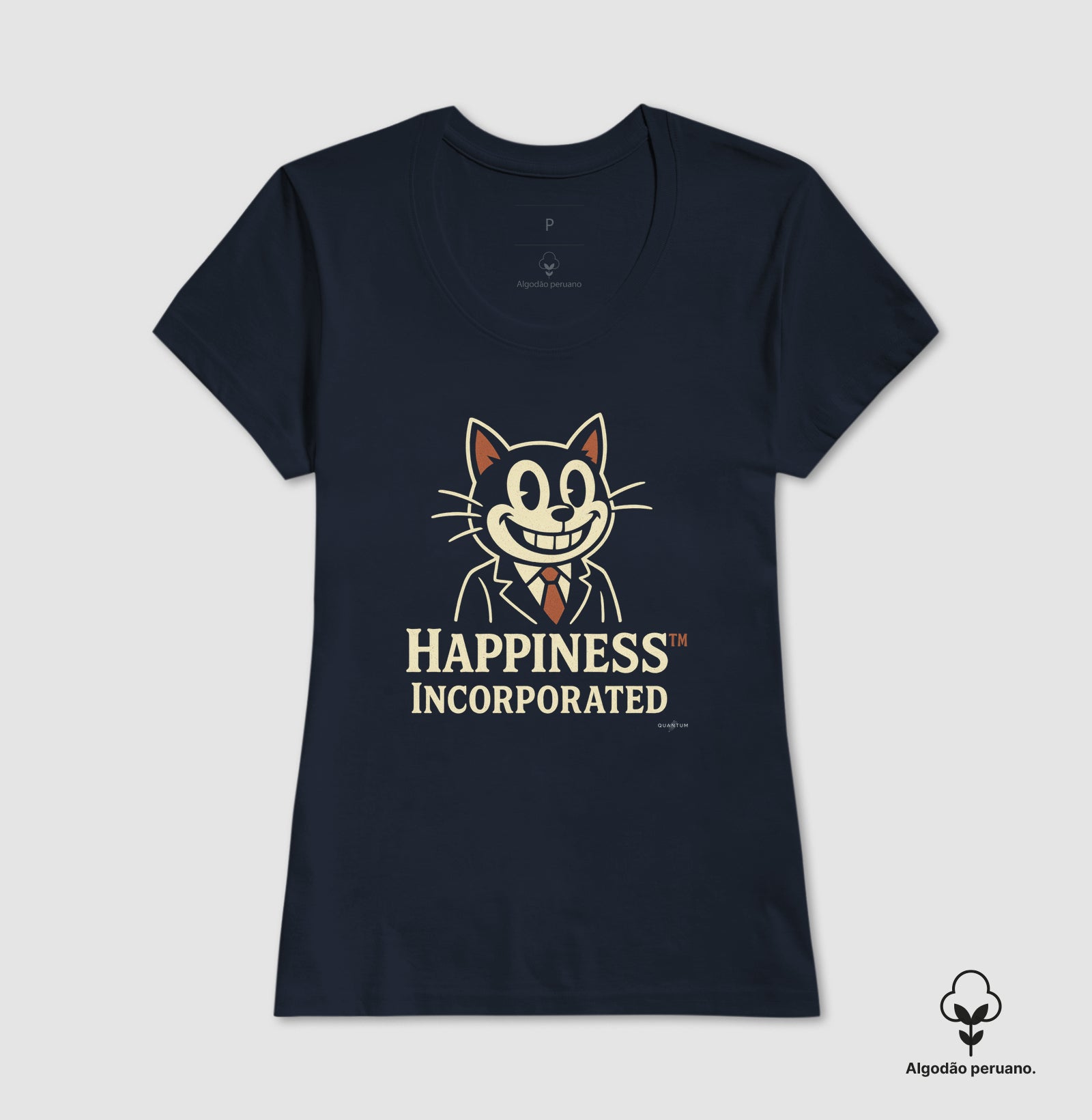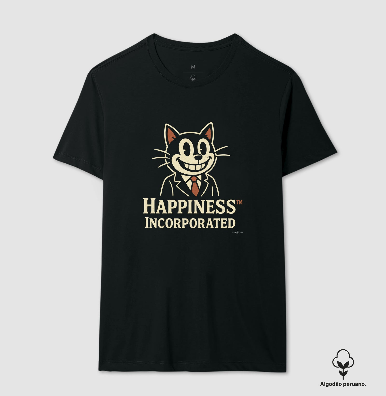 Estampa central e cômica, em estilo de desenho animado vintage. Apresenta um gato sorridente (e talvez levemente sinistro), vestido com um terno e gravata, simbolizando um executivo ou mascote corporativo. Abaixo, a frase "HAPPINESS™ INCORPORATED" com a marca registrada, sugere que até mesmo a felicidade virou um produto de mercado.