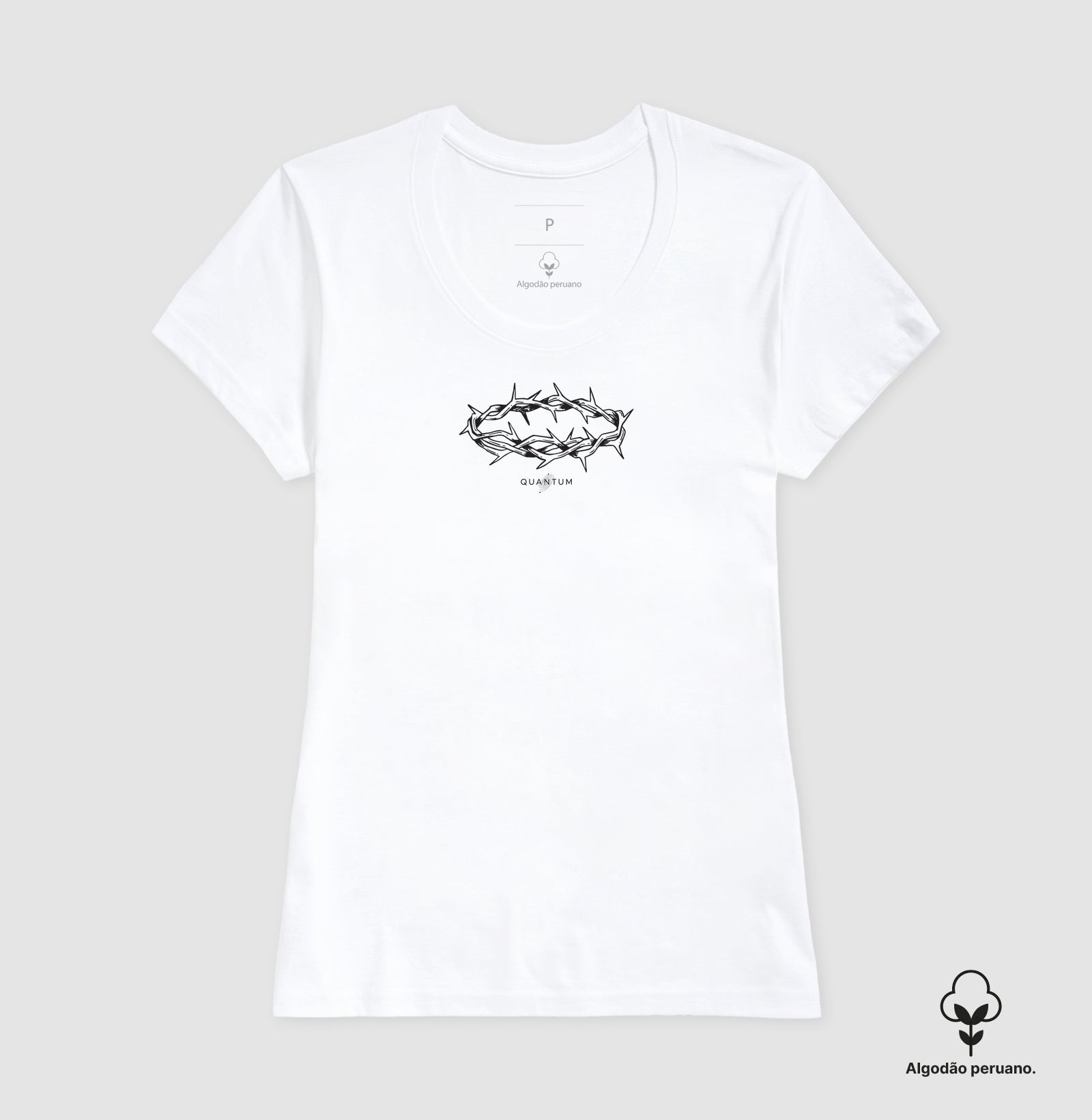 Estampa de coroa de espinhos em traço fino e detalhado, posicionada no peito para um impacto visual discreto e cheio de propósito.