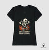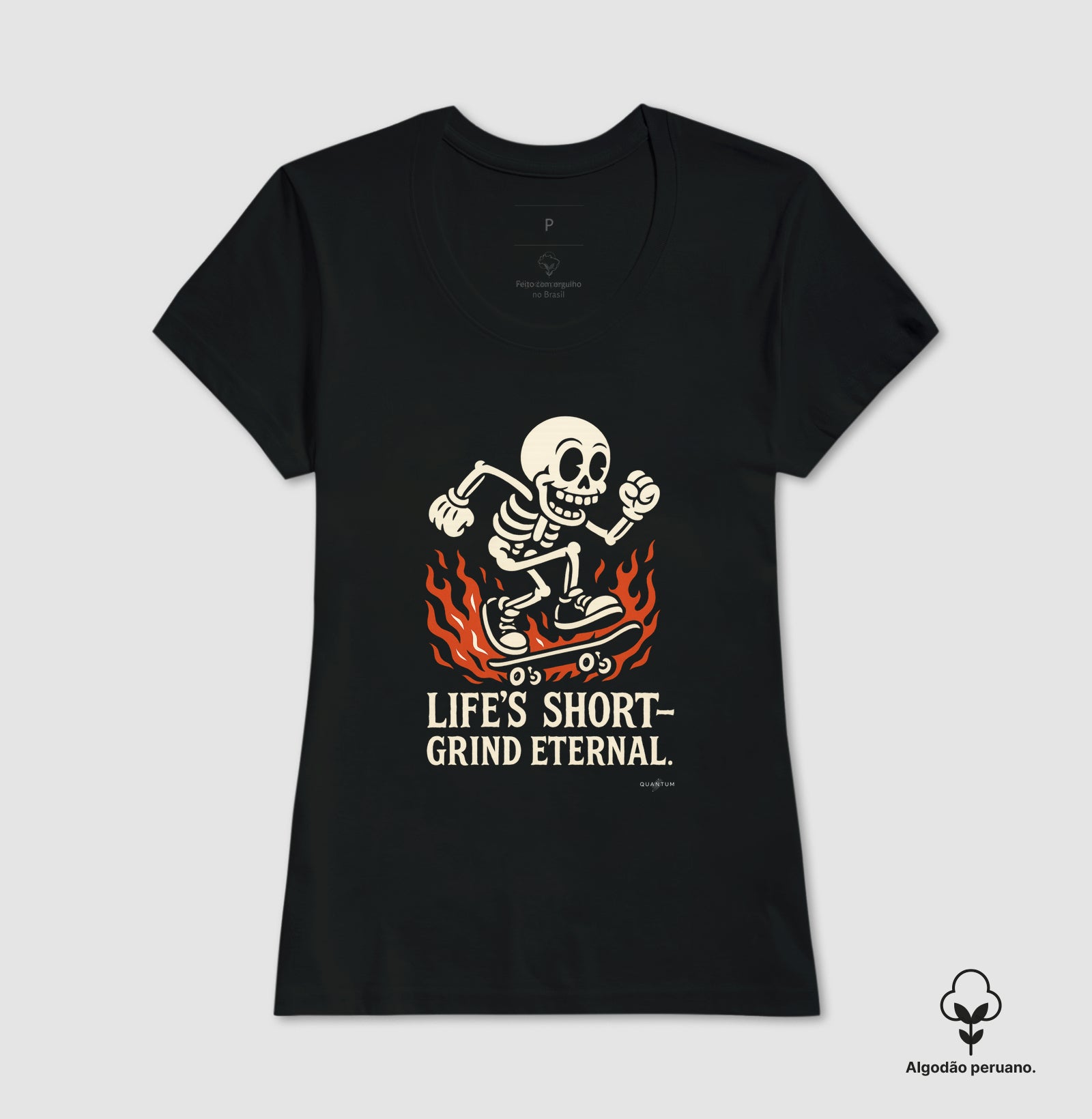 Estampa central e ousada, em estilo de desenho animado clássico. Apresenta um esqueleto sorridente em chamas, praticando skate sobre o fogo, demonstrando dedicação e foco eterno. Abaixo, a frase "LIFE'S SHORT – GRIND ETERNAL" (A Vida É Curta – O Esforço É Eterno) incentiva a dedicação contínua.