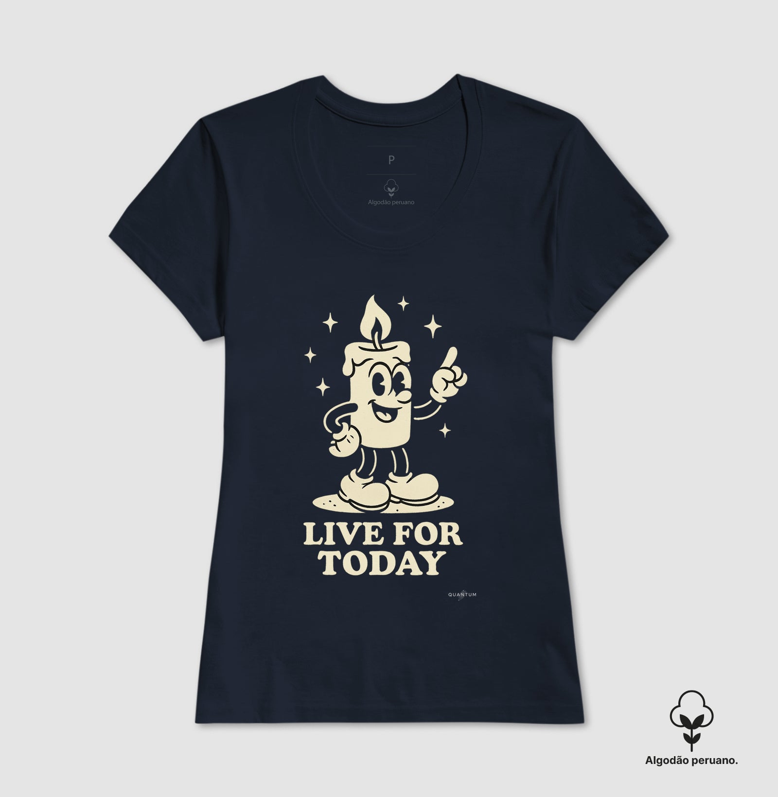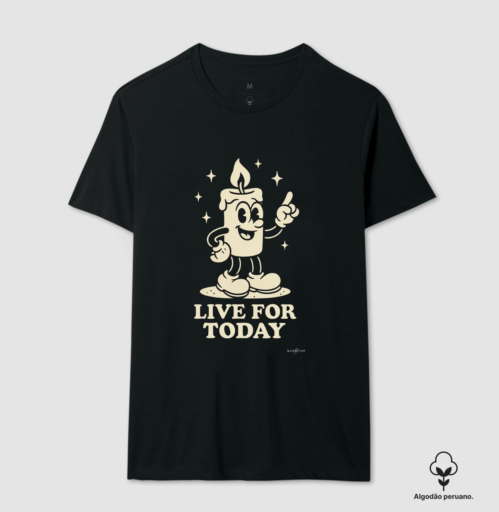 Estampa central e alegre, em estilo de desenho animado vintage. Apresenta uma vela sorridente e animada em pose otimista, com estrelas ao redor. Abaixo, a frase "LIVE FOR TODAY" reforça a mensagem de aproveitar o momento, enquanto o design da vela sugere viver intensamente, antes de "apagar".