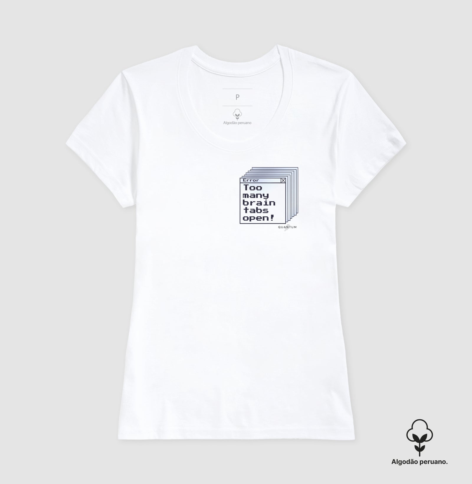 Estampa minimalista e temática, apresentando uma pilha de janelas pop-up de "Erro" do sistema operacional em estilo retrô, com a mensagem: "Error. Too many brain tabs open!". A estampa é posicionada de forma discreta no peito, adicionando um toque de humor nerd ao visual.