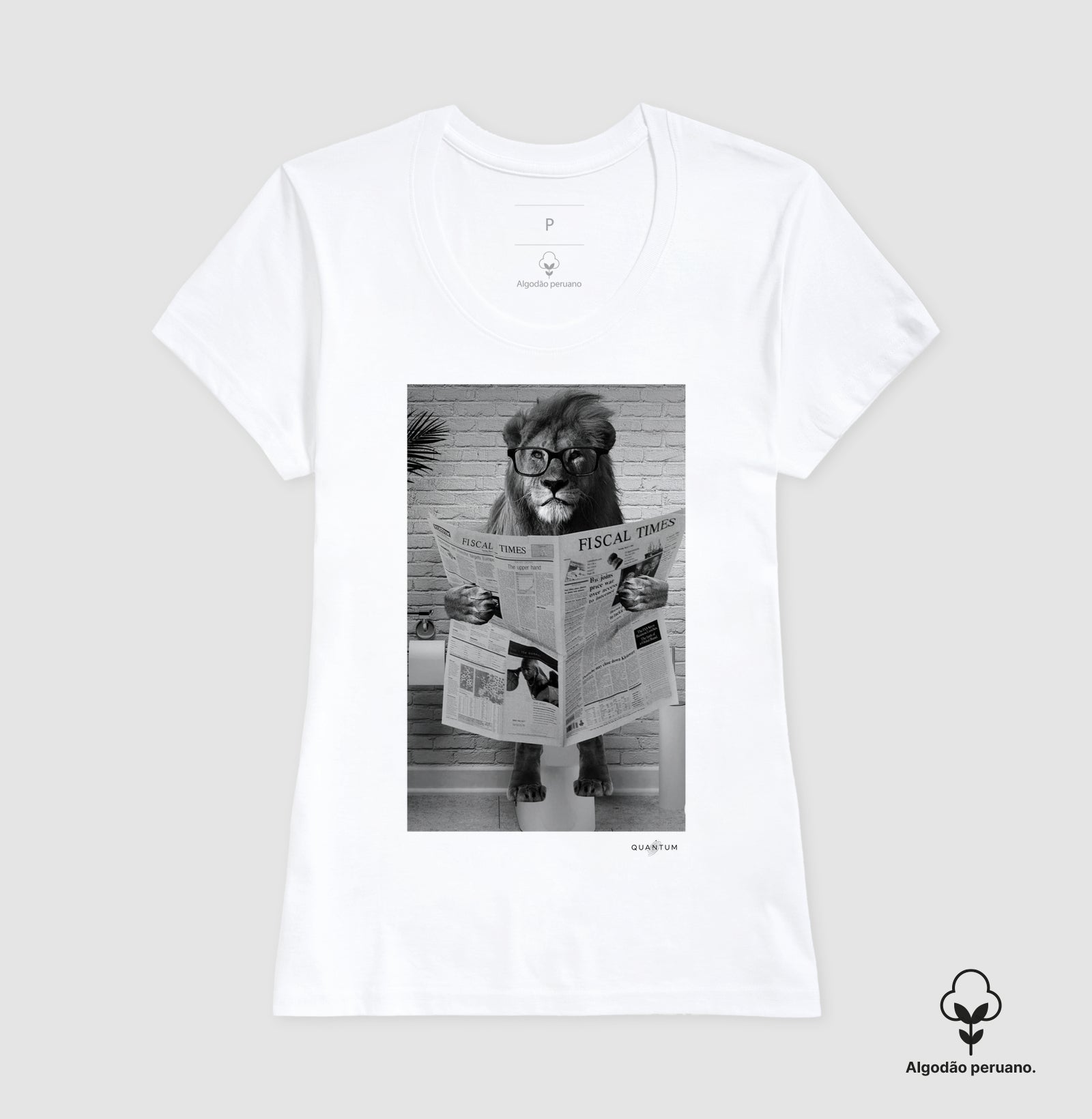 Estampa central e em preto e branco, retratando um leão sentado em um vaso sanitário, lendo um jornal chamado "Fiscal Times" e usando óculos. A imagem humaniza o "rei da selva" em um momento privado e universalmente reconhecido, criando um ponto focal visualmente hilário e irreverente.