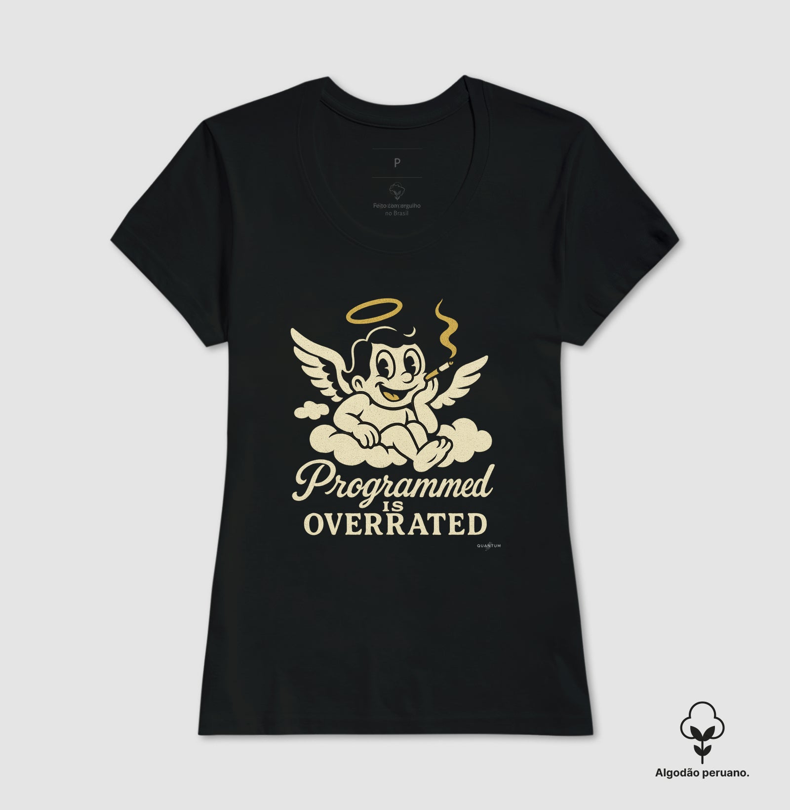Estampa central e ousada, em estilo de desenho animado vintage. Apresenta um anjo ou cupido sentado confortavelmente em uma nuvem, fumando um cigarro. Abaixo, a frase "PROGRAMMED IS OVERRATED" (Ser Programado é Superestimado) sugere uma atitude de desprendimento das expectativas sociais e das regras.