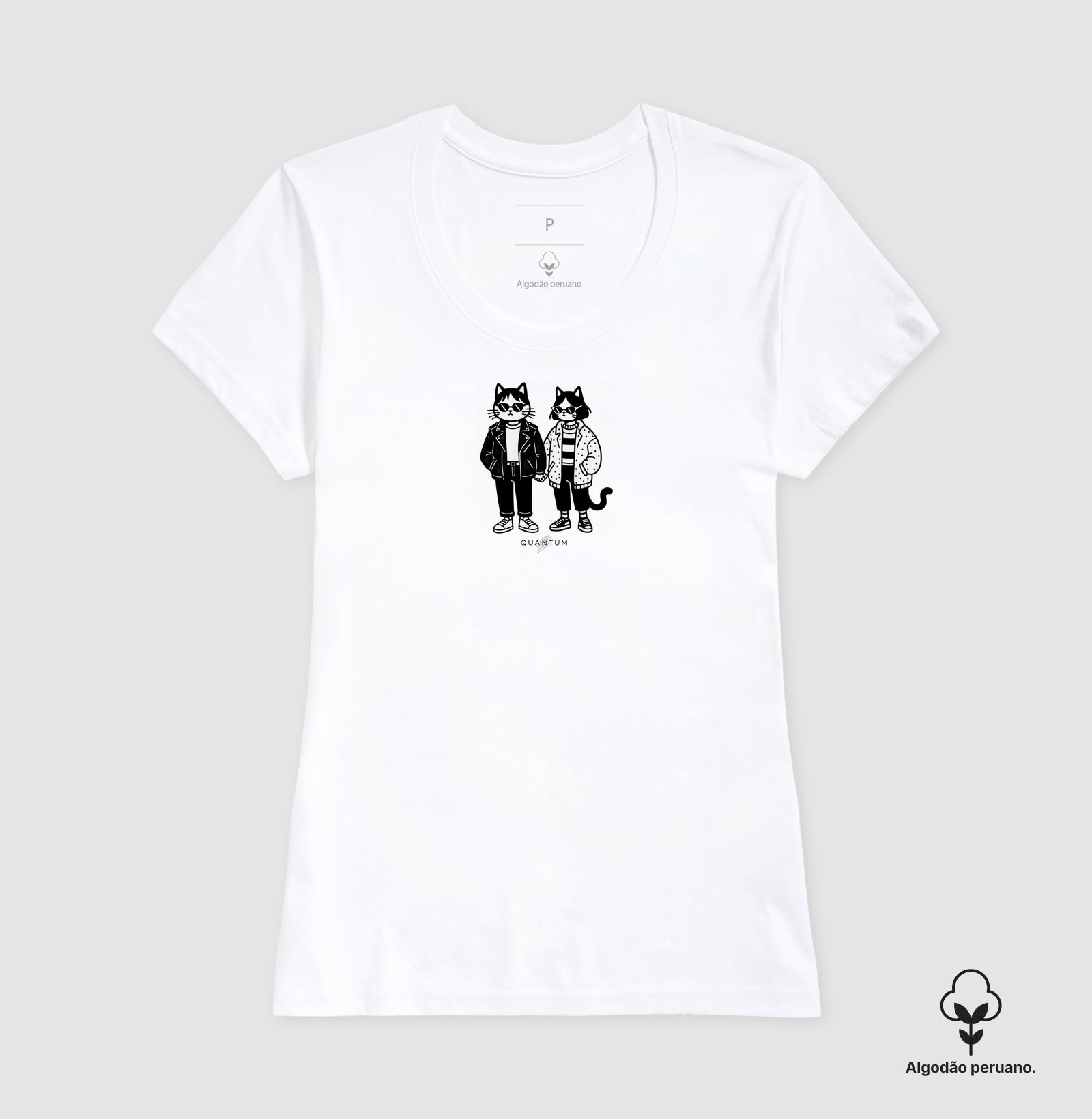 Estampa central em traço minimalista e divertido, apresentando dois gatos humanizados de mãos dadas, vestidos com roupas estilosas e modernas. A estampa é charmosa e sugere um romance descolado.