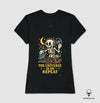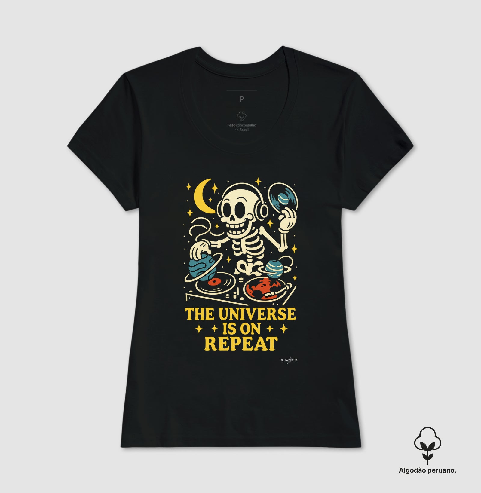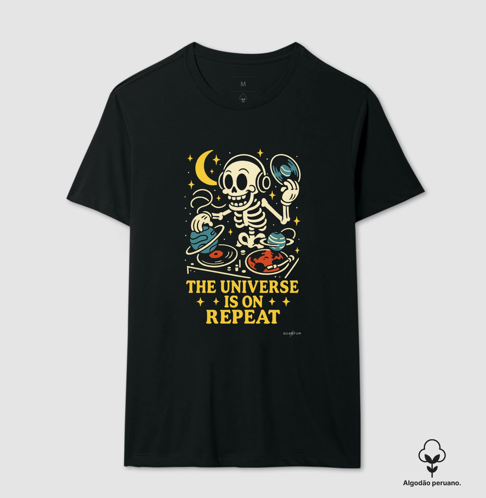 Estampa central e colorida, em estilo de desenho animado vintage. Apresenta um esqueleto DJ animado usando fones de ouvido e mixando discos de vinil que, na verdade, são planetas. O cenário é o espaço sideral, com estrelas e a lua. Abaixo, a frase "THE UNIVERSE IS ON REPEAT" sugere a repetição constante de ciclos na vida ou na música.