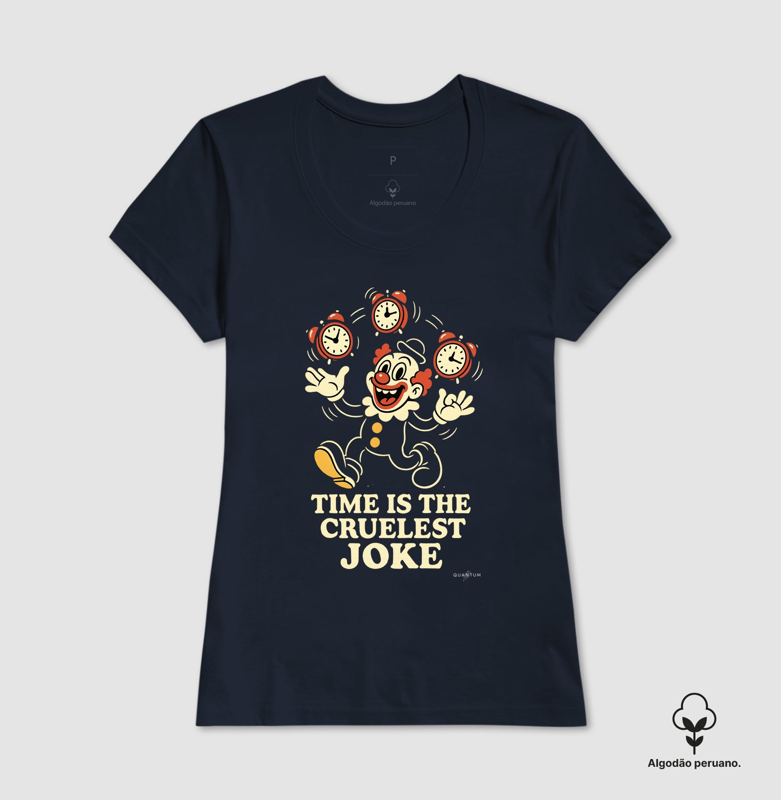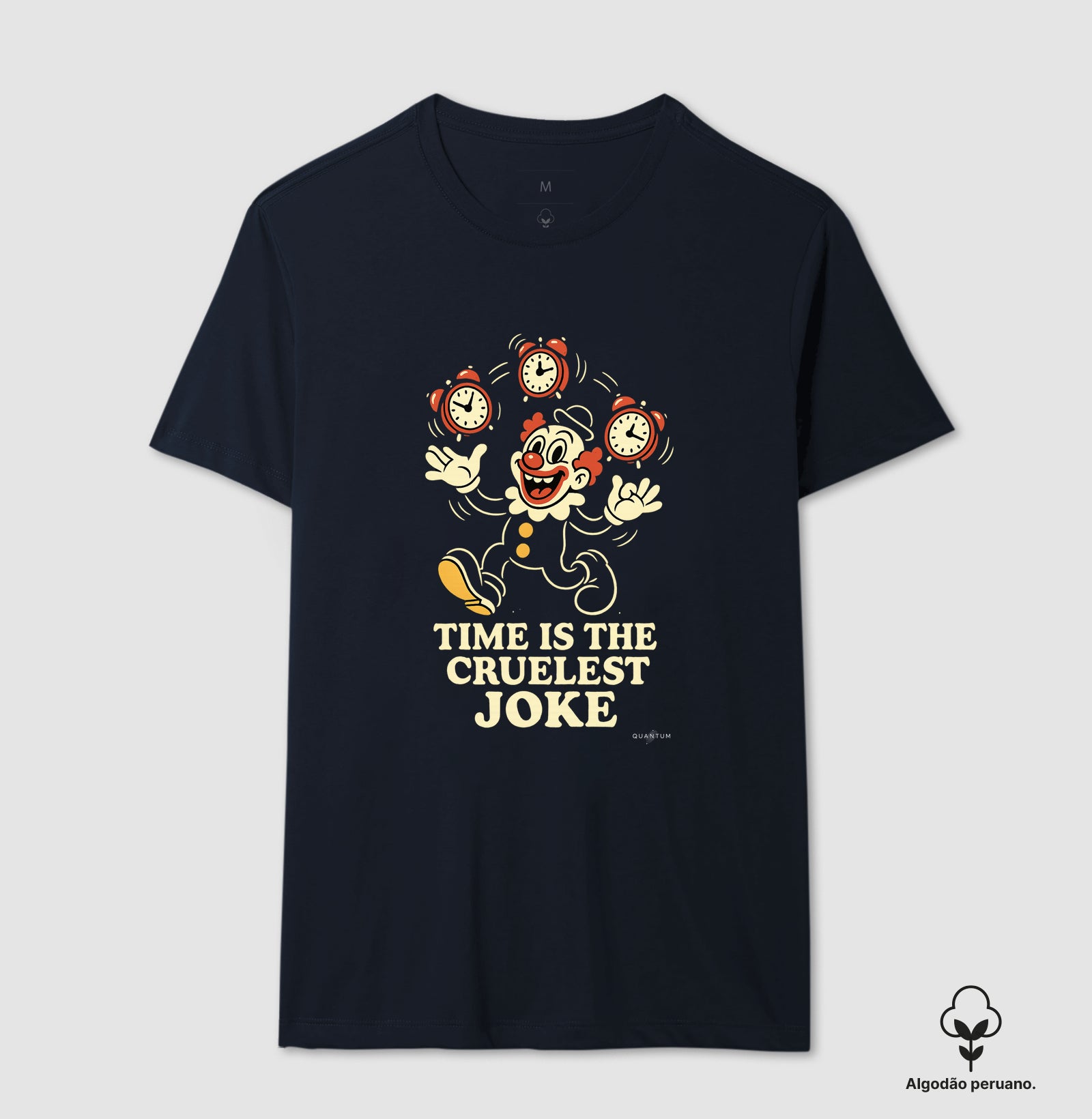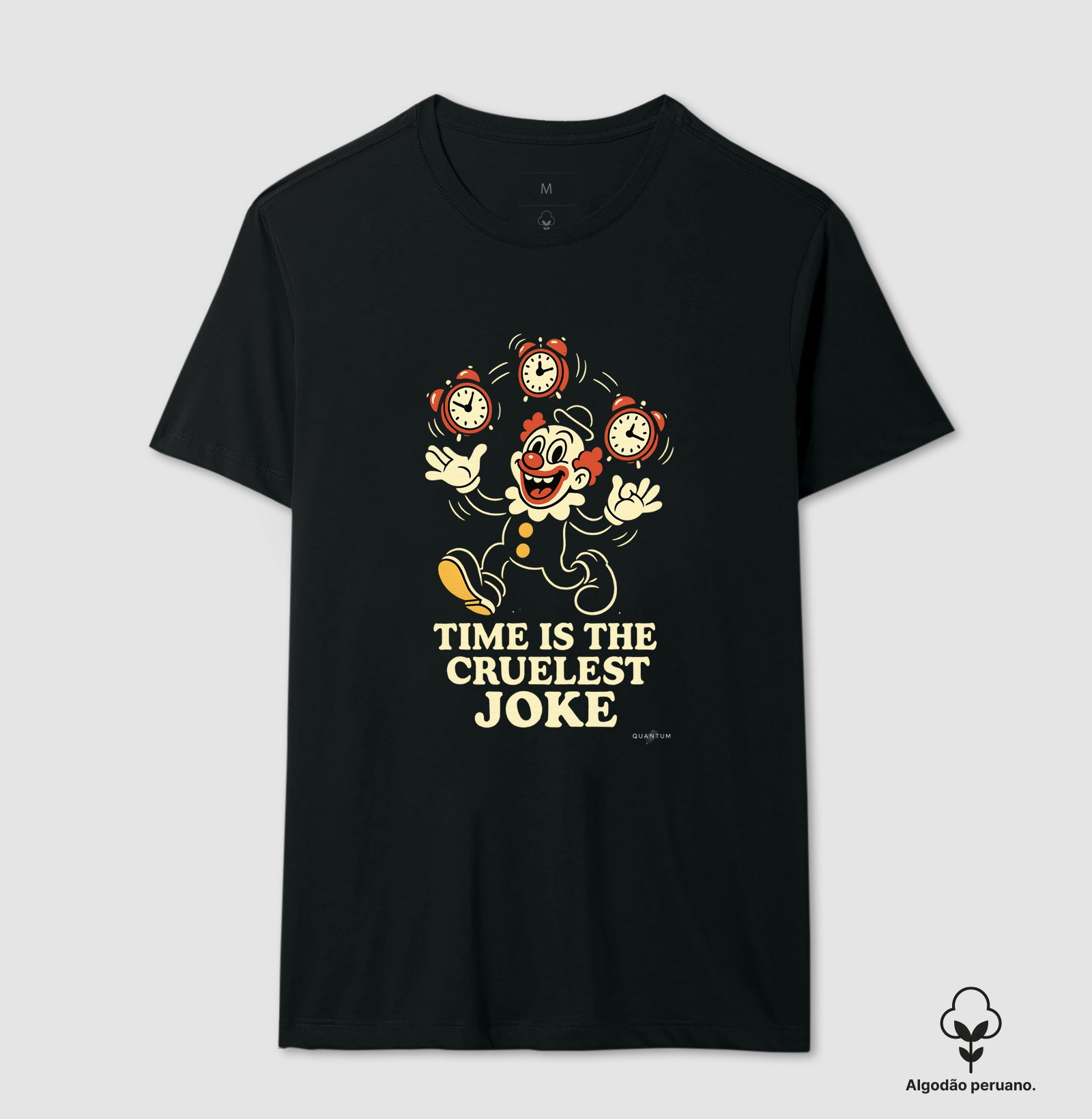 Estampa central e colorida, em estilo de desenho animado vintage. Apresenta um palhaço sorridente fazendo malabarismo com vários despertadores que tocam incessantemente. Abaixo, a frase "TIME IS THE CRUELEST JOKE" sugere a natureza implacável e zombeteira do tempo que nunca para.