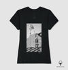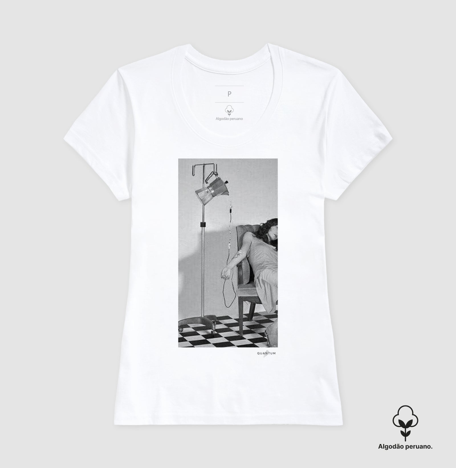 Estampa central em preto e branco e formato vertical. Apresenta uma cena dramática e irônica de uma pessoa recebendo uma "transfusão" de um líquido escuro por meio de um equipamento médico, ilustrando de forma bem-humorada e visualmente impactante a dependência moderna da cafeína.