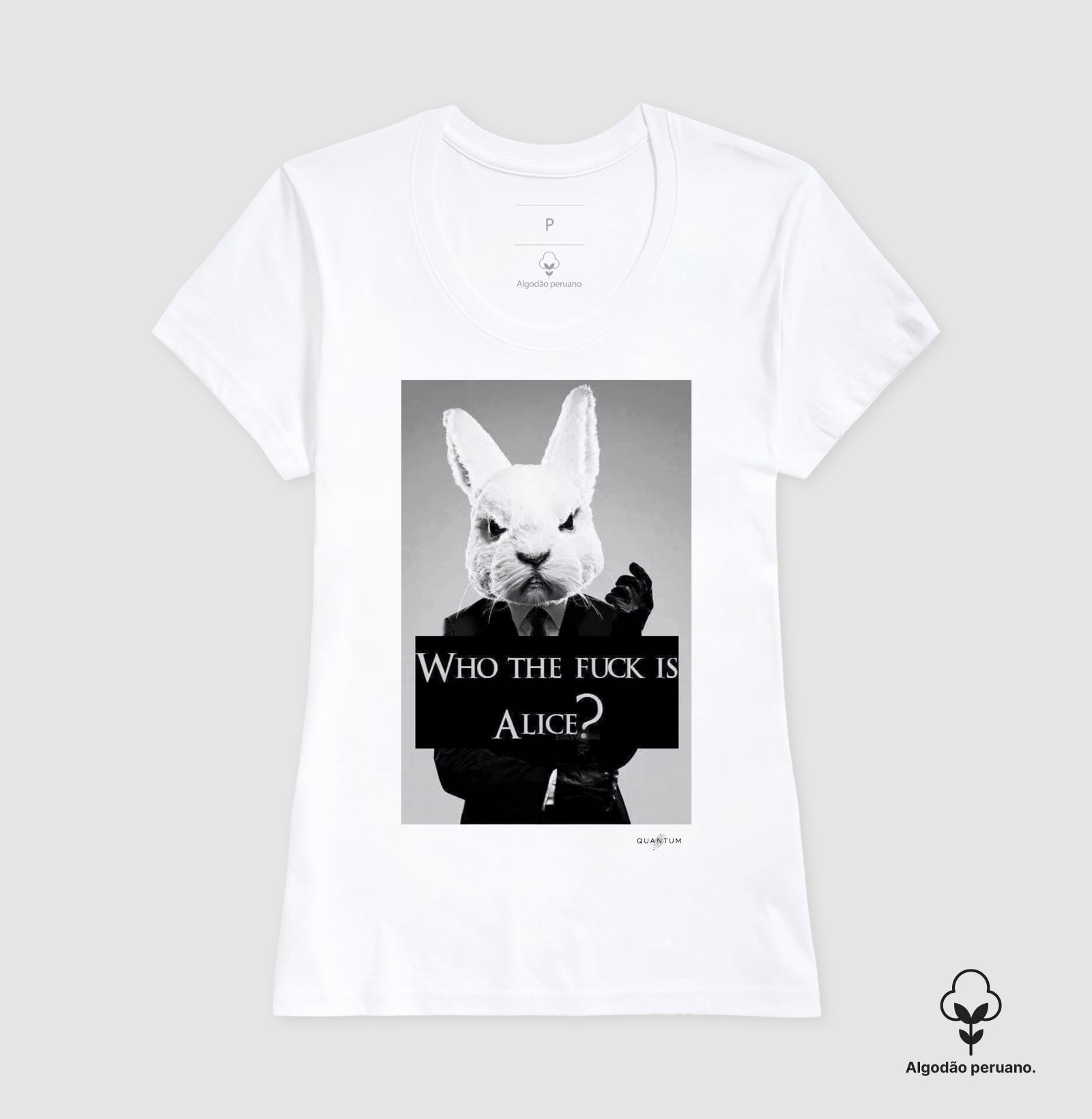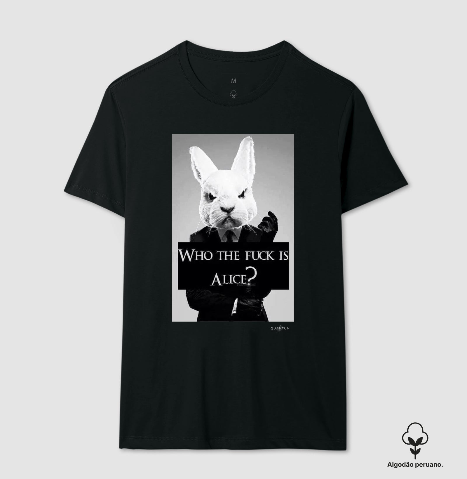 Estampa central em preto e branco e formato vertical. Apresenta um coelho em traje social, com pose agressiva e imponente. A imagem é sobreposta pela frase em letras brancas: "WHO THE FUCK IS ALICE" (Quem Diabos É Alice), reforçando a mensagem crítica e subversiva.