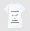 Estampa central e temática, apresentando a estrutura molecular da Cafeína (C8H10N4O2) em traço fino e preciso, dentro de um quadro. Abaixo da estrutura, está escrita a palavra "caffeine". A estampa tem um impacto visual bold e educativo, celebrando a química.