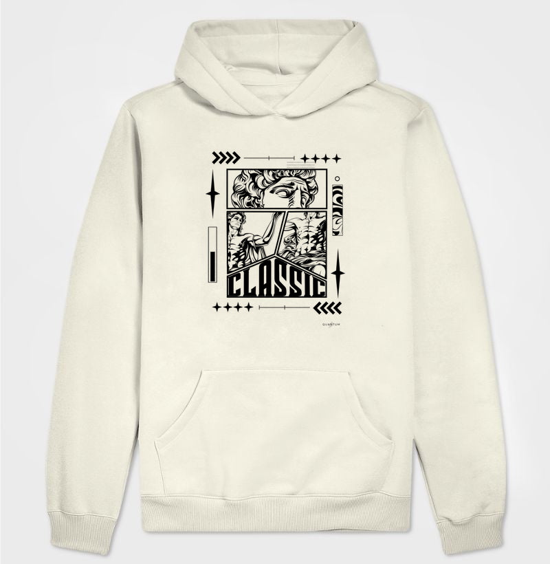 O Moletom com Capuz "Classic" é a escolha ideal para quem busca o máximo de conforto e estilo. Ele une o aconchego do moletom com a versatilidade do capuz e bolso canguru, com um design que celebra a arte de forma arrojada e contemporânea.