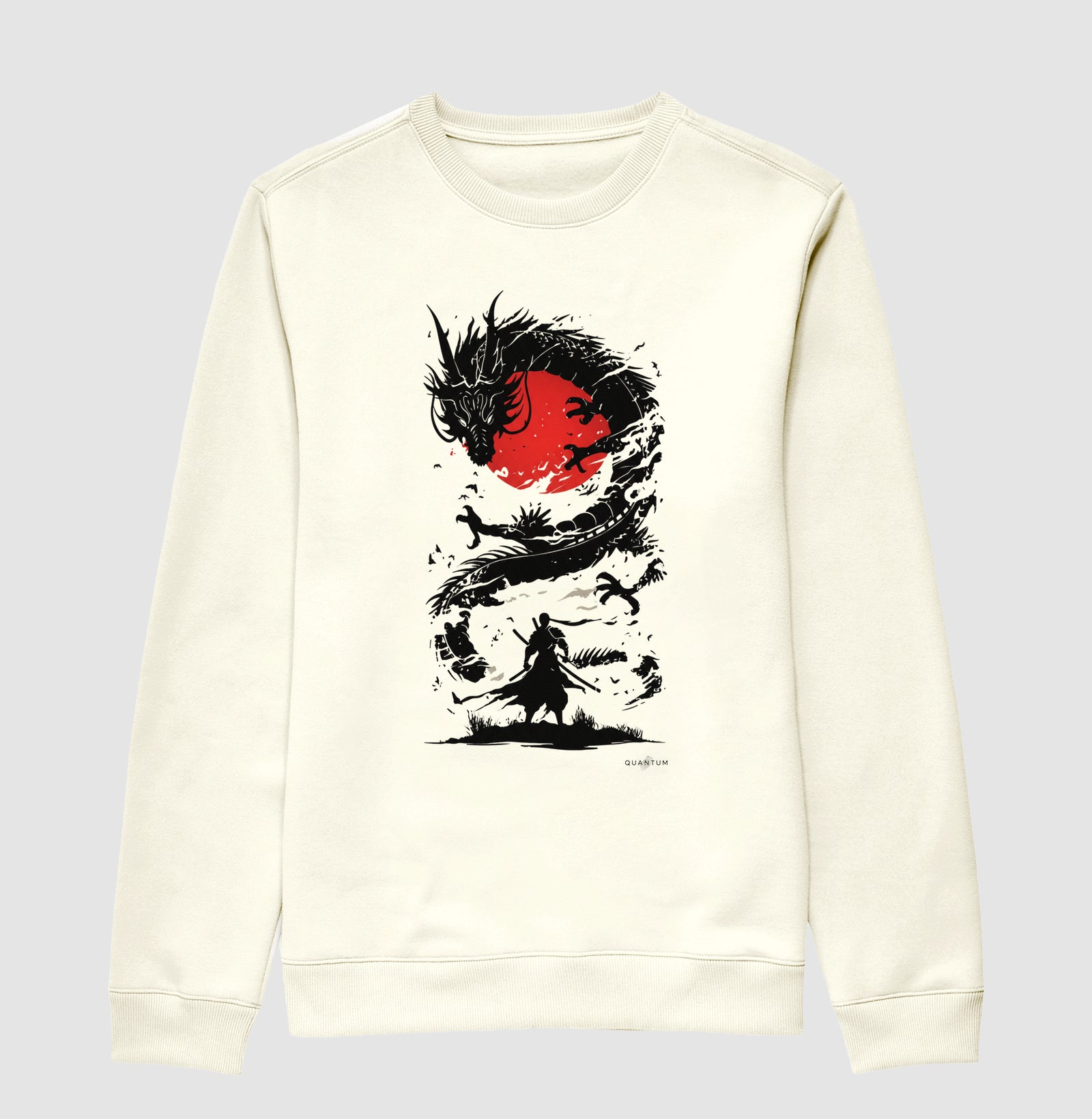 Estampa central e imponente, apresentando a silhueta de um dragão oriental em tons de preto e cinza, emoldurado por um sol vermelho intenso (alusão à bandeira japonesa). Abaixo do dragão, a figura de um guerreiro (samurai ou espadachim) em pose de combate adiciona um toque épico e de desafio.