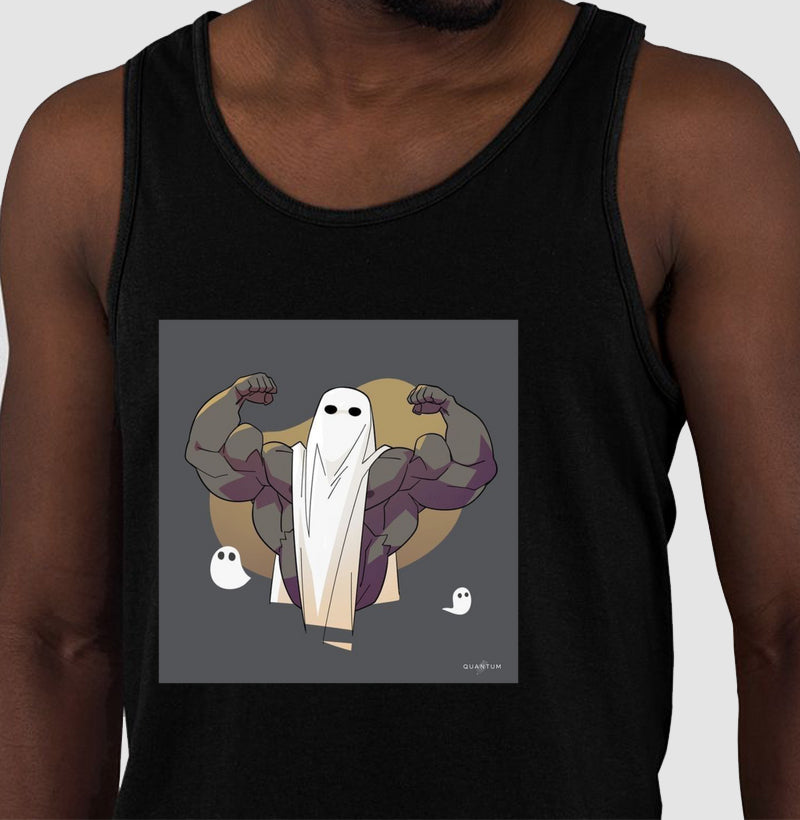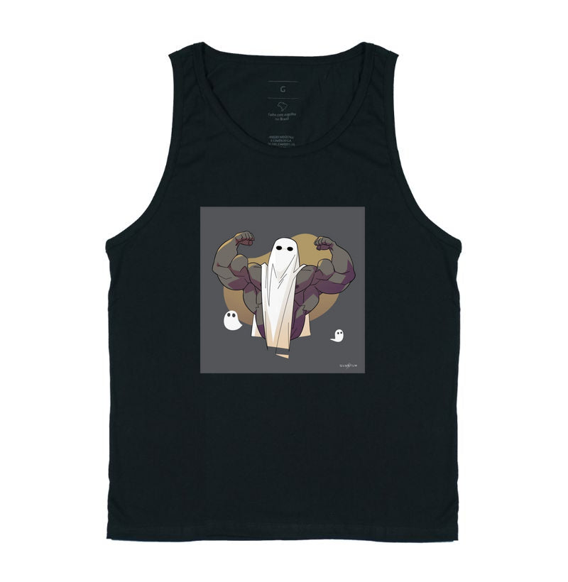 Estampa central e bem-humorada, apresentando um fantasma clássico que, surpreendentemente, revela braços e ombros extremamente musculosos. O design é cômico e une o mundo paranormal à rotina hardcore da academia.